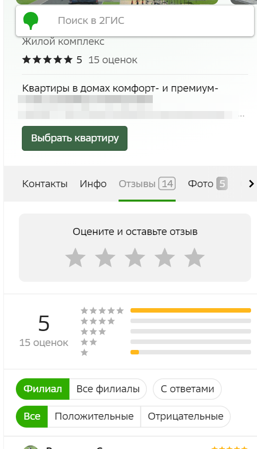 После завершения работы, рейтинг жилого комплекса на 2ГИС существенно улучшился. Ниже представлены изображения рейтинга «После» выполнения услуги: